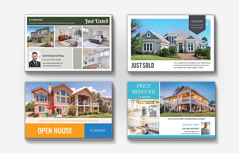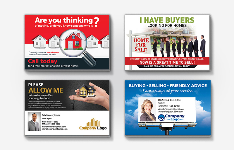 Need postcards for your next direct mail campaign? We have over fifty categories of branded designs for real estate agents to use! Our postcards are printed on heavy 130 pound stock paper with a high-quality UV coating. (None of the flimsy stuff for our clients!) Select from standard size (4.5” x 5.5”) or make a bigger splash with our jumbo (5.5” x 8.5”) postcards. Craft your own custom card in minutes using our online design center’s vast library of custom templates and graphics with your own images and text.