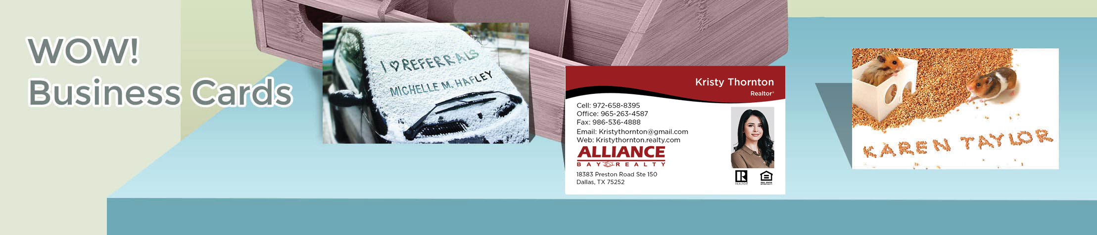 Looking to add a touch of WOW! factor to your real estate business cards? These cards are just what you've been looking for. The front of the card has plenty of space for all the traditional business and contact information you want to include. But instead of a boring white back, the reverse of the card lets you spell out your name in snow flakes, autumn leaves, or even Easter eggs. It's a great way to add some personality, some pizazz, even some WOW! to your Alliance Bay Realty real estate business cards!