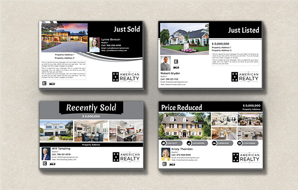 Need postcards for your next direct mail campaign? We have over fifty categories of branded designs for our The American Realty International real estate agents to use! Our postcards are printed on heavy 130 pound stock paper with a high-quality UV coating. (None of the flimsy stuff for our clients!) Select from standard size (4.5” x 5.5”) or make a bigger splash with our jumbo (5.5” x 8.5”) postcards. Craft your own custom card in minutes using our online design center’s vast library of custom templates and graphics with your own images and text.