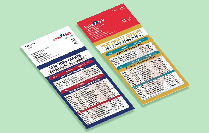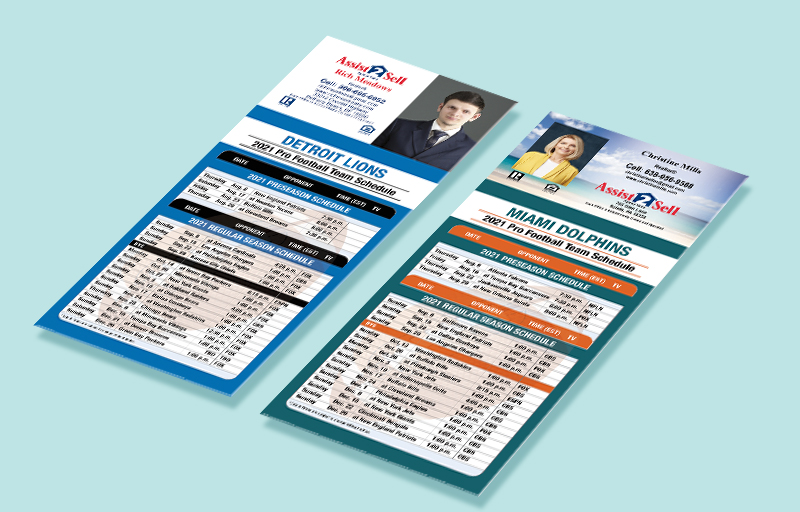 Business card magnetic schedules are some of the most versatile magnetic schedules we offer. Choose from a huge array of customizable design options, including special designs for luxury homes, commercial real estate, real estate agent teams, and even designs that allow you to upload a unique QR code. Available in team colors for any NFL team, these magnetic business card football schedules have Assist2Sell Real Estate branding built right into the template, making ordering a snap for all of our Assist2Sell Real Estate agents.