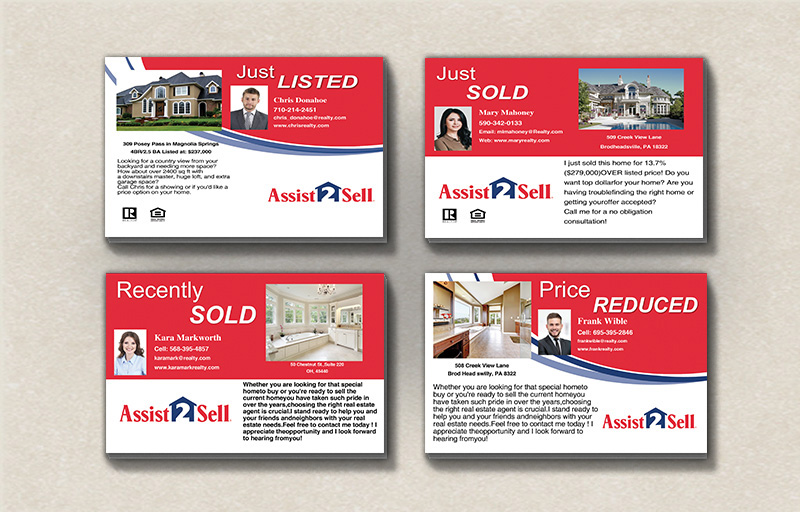 Need postcards for your next direct mail campaign? We have over fifty categories of branded designs for our Assist2sell real estate agents to use! Our postcards are printed on heavy 130 pound stock paper with a high-quality UV coating. (None of the flimsy stuff for our clients!) Select from standard size (4.5” x 5.5”) or make a bigger splash with our jumbo (5.5” x 8.5”) postcards. Craft your own custom card in minutes using our online design center’s vast library of custom templates and graphics with your own images and text.
