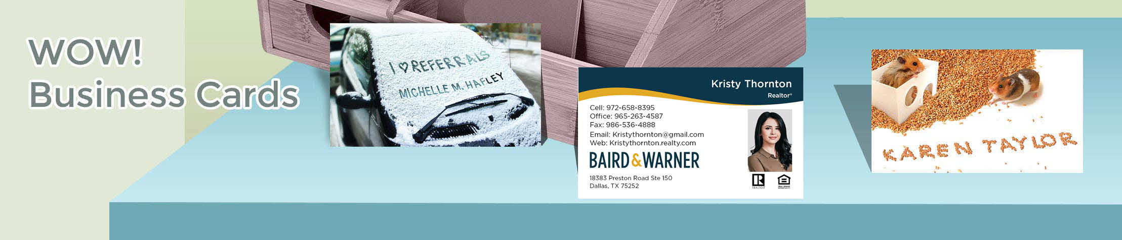 Looking to add a touch of WOW! factor to your real estate business cards? These cards are just what you've been looking for. The front of the card has plenty of space for all the traditional business and contact information you want to include. But instead of a boring white back, the reverse of the card lets you spell out your name in snow flakes, autumn leaves, or even Easter eggs. It's a great way to add some personality, some pizazz, even some WOW! to your Baird & Warner real estate business cards!