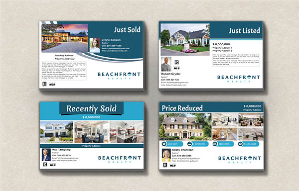 Need postcards for your next direct mail campaign? We have over fifty categories of branded designs for our BeachFront Realty International real estate agents to use! Our postcards are printed on heavy 130 pound stock paper with a high-quality UV coating. (None of the flimsy stuff for our clients!) Select from standard size (4.5” x 5.5”) or make a bigger splash with our jumbo (5.5” x 8.5”) postcards. Craft your own custom card in minutes using our online design center’s vast library of custom templates and graphics with your own images and text.