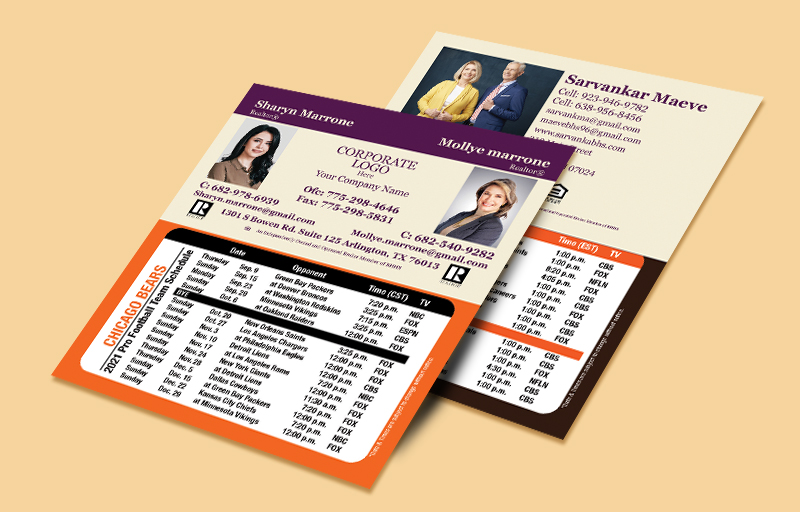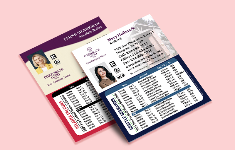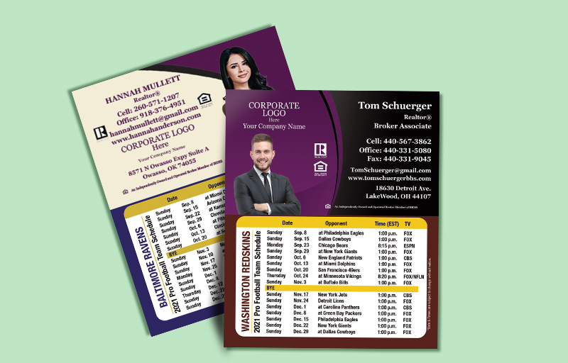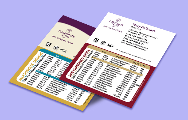 Our popular full magnetic schedules are now available in a compact size that keeps the important information front and center, without taking up too much of your clients' valuable fridge space. These NFL magnets are a great real estate marketing tool. They are available in custom colors for every team in the league, and indicate the opposing team, location, time, and broadcast channel for each game of the pre-season and regular season.