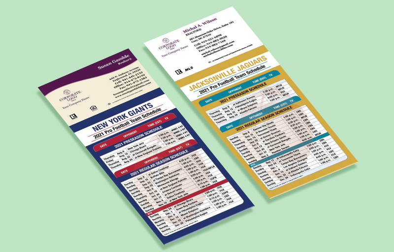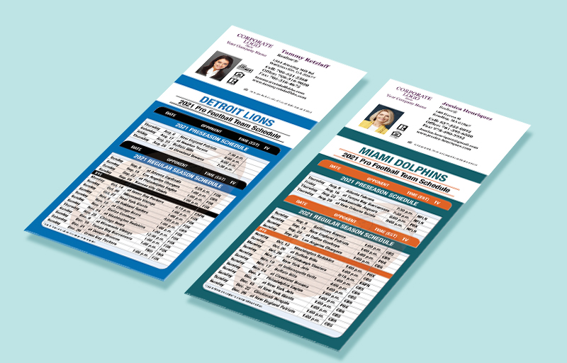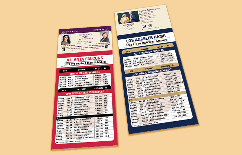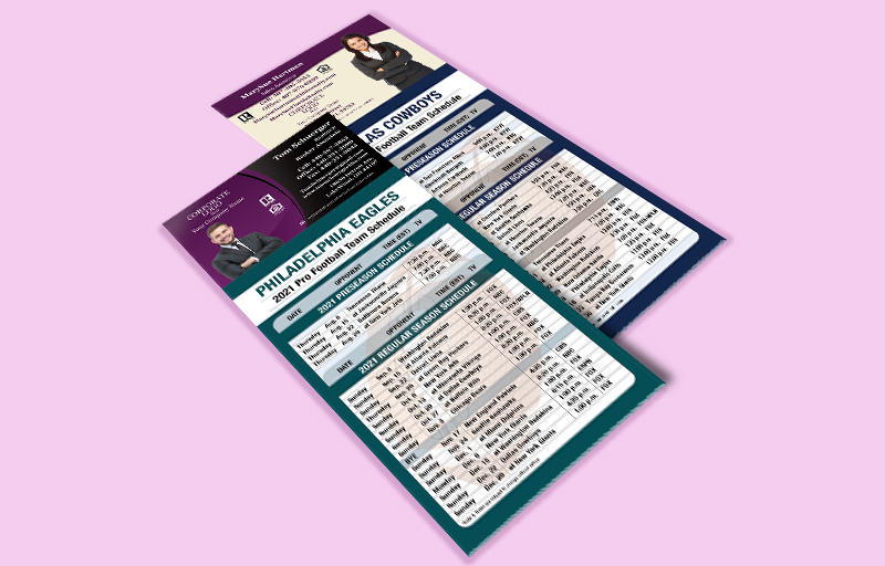 Business card magnetic schedules are some of the most versatile magnetic schedules we offer. Choose from a huge array of customizable design options, including special designs for luxury homes, commercial real estate, real estate agent teams, and even designs that allow you to upload a unique QR code. Available in team colors for any team, these magnetic business card football schedules have Berkshire Hathaway branding built right into the template, making ordering a snap for all of our Berkshire Hathaway agents.