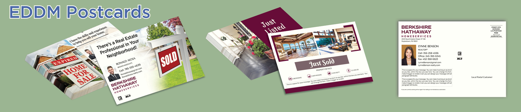 Make mailing lists a thing of the past with on-target, on-budget EDDM real estate postcards. With the USPS’s Every Door Direct Mail program, you can select your target area by city, street name, or zip code, and deliver to every house along the mailing route. BestPrintBuy offers a huge selection of customizable real estate EDDM postcards that meet the requirements of the program. All you have to do is choose a style you like, customize your message, and take your cards to the post office once they arrive.
