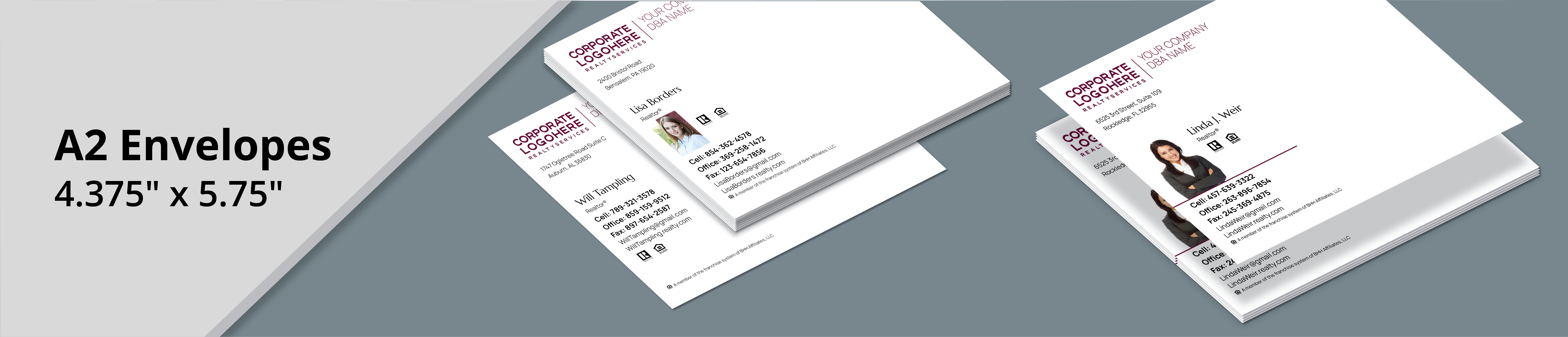A big message deserves to make a big impact. When you want to send out Berkshire Hathaway Realty holiday cards, greeting cards, or announcement cards, don’t toss them in a generic white envelope – use our custom Berkshire Hathaway A2 envelopes to double the impact of your mailing. Pre-printed custom envelopes save time when addressing your mailers, too! Personalize the envelopes with contact information for your local office, or for individual agents. The option to add an agent photo allows agents to reinforce their brand with every mailing they send out.