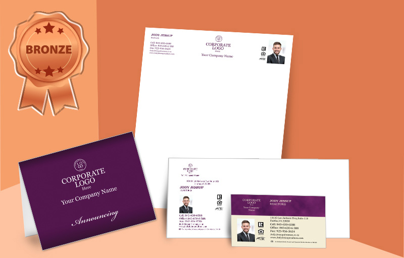 An agent bronze starter kit has 250 business cards, 250 letterheads, 250 #10 envelopes and 50 standard folded note cards with envelopes. All you need to do is design your business card and we will craft your entire package for you.