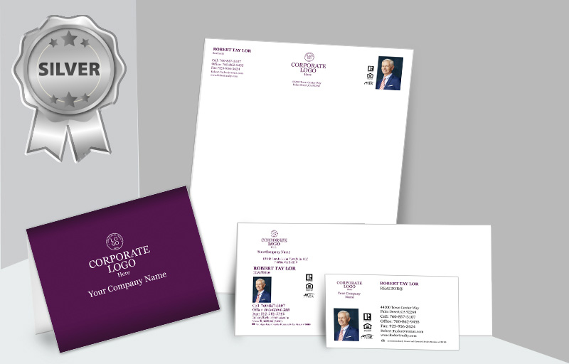 An agent silver starter kit has 1000 business cards, 250 letterheads, 250 #10 envelopes and 50 standard folded note cards with envelopes. All you need to do is design your business card and we will craft your entire package for you.