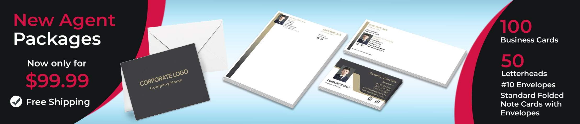 New agent package starter kit has 100 business cards, 50 letterheads, 50 #10 envelopes and 50 standard folded note cards with envelopes. This is the best package to get you started and to keep you going on. All you need to do is design your business card and we will craft your entire package for you.