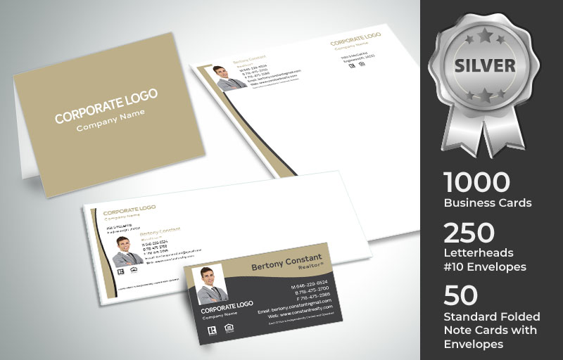 An agent silver starter kit has 1000 business cards, 250 letterheads, 250 #10 envelopes and 50 standard folded note cards with envelopes. All you need to do is design your business card and we will craft your entire package for you.
