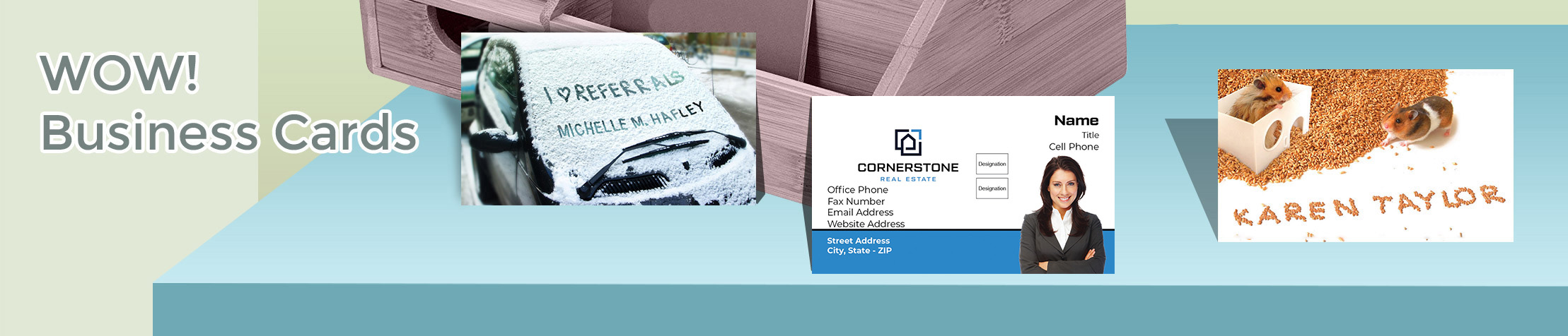 Looking to add a touch of WOW! factor to your real estate business cards? These cards are just what you've been looking for. The front of the card has plenty of space for all the traditional business and contact information you want to include. But instead of a boring white back, the reverse of the card lets you spell out your name in snow flakes, autumn leaves, or even Easter eggs. It's a great way to add some personality, some pizazz, even some WOW! to your Cornerstone Real Estate real estate business cards!