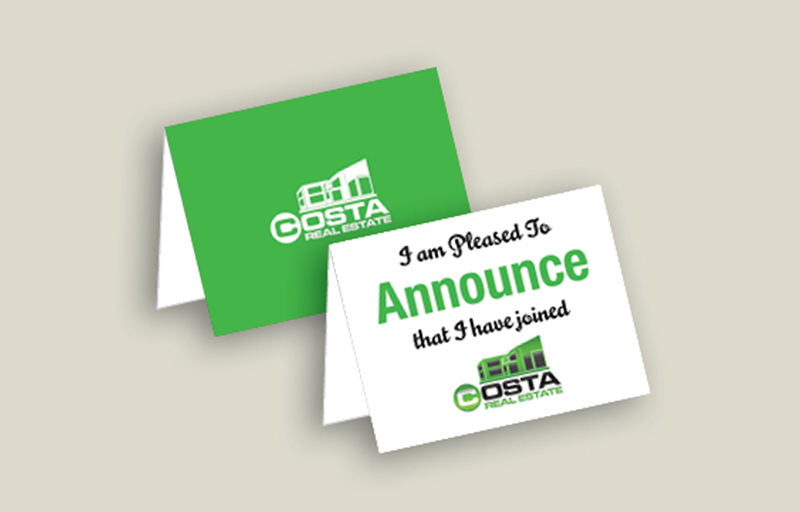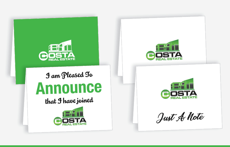 When it comes to marketing your real estate business, nothing beats the personal touch. Costa Real Estate folded note cards are an excellent way to keep in touch with past clients, set yourself apart with a promising prospect, or to say “Congrats!” after a close or “Thanks for your business!” when you land a listing. Our blank cards in your choice of bold Costa Real Estate colors are a great way to make your message your own, or you can give your direct mail marketing a special appeal with personalized folded note cards. Choose from standard or jumbo-sized cards, available in a wide range of designer styles and templates.