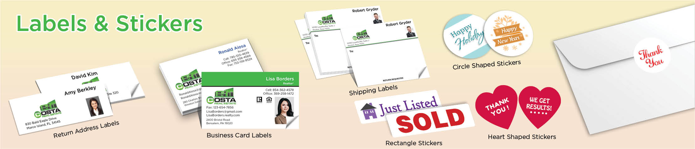Explore our range of Costa Real Estate stickers, Costa Real Estate return address labels and more by clicking the links below: