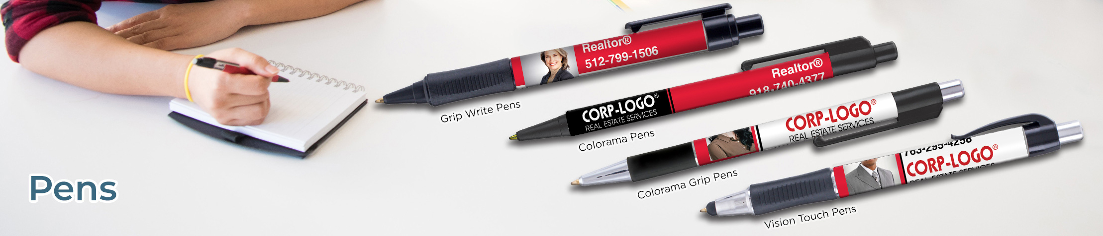 Personalized pens have been a classic real estate promotional item for years, and for good reason – it doesn’t get much more useful than an ink pen. We offer three varieties of grip pen with an imprint area greater than 3 inches, as well as a Colorama pen with a longer imprint area. Choose from blue or black EverSmooth ink on any of our Crye Leike pens, as well as personalization with all of your contact info and even a photo option.