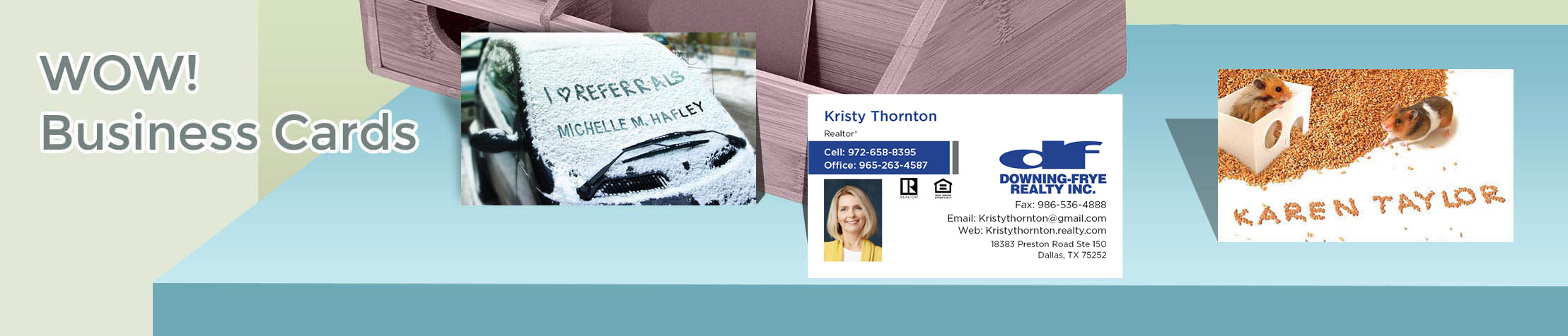 Looking to add a touch of WOW! factor to your real estate business cards? These cards are just what you've been looking for. The front of the card has plenty of space for all the traditional business and contact information you want to include. But instead of a boring white back, the reverse of the card lets you spell out your name in snow flakes, autumn leaves, or even Easter eggs. It's a great way to add some personality, some pizazz, even some WOW! to your Downing Frye Realty real estate business cards!
