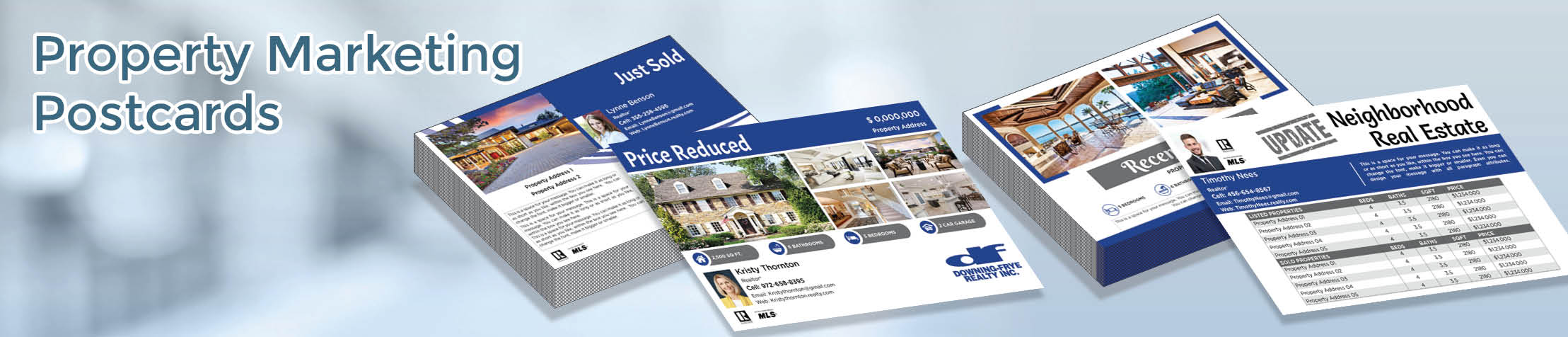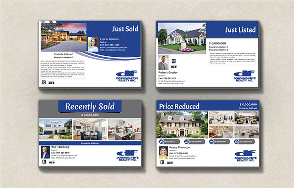 Need postcards for your next direct mail campaign? We have over fifty categories of branded designs for our Downing Frye Realty International real estate agents to use! Our postcards are printed on heavy 130 pound stock paper with a high-quality UV coating. (None of the flimsy stuff for our clients!) Select from standard size (4.5” x 5.5”) or make a bigger splash with our jumbo (5.5” x 8.5”) postcards. Craft your own custom card in minutes using our online design center’s vast library of custom templates and graphics with your own images and text.