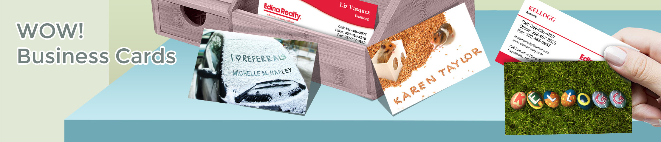 Looking to add a touch of WOW! factor to your real estate business cards? These cards are just what you've been looking for. The front of the card has plenty of space for all the traditional business and contact information you want to include. But instead of a boring white back, the reverse of the card lets you spell out your name in snow flakes, autumn leaves, or even Easter eggs. It's a great way to add some personality, some pizazz, even some WOW! to your Edina Realty real estate business cards!
