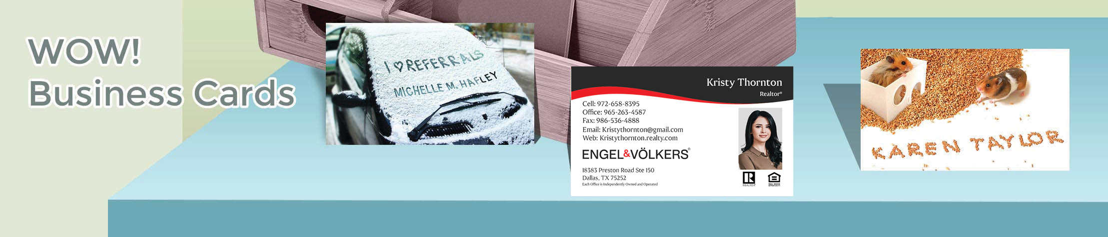 Looking to add a touch of WOW! factor to your real estate business cards? These cards are just what you've been looking for. The front of the card has plenty of space for all the traditional business and contact information you want to include. But instead of a boring white back, the reverse of the card lets you spell out your name in snow flakes, autumn leaves, or even Easter eggs. It's a great way to add some personality, some pizazz, even some WOW! to your Engel Volkers real estate business cards!