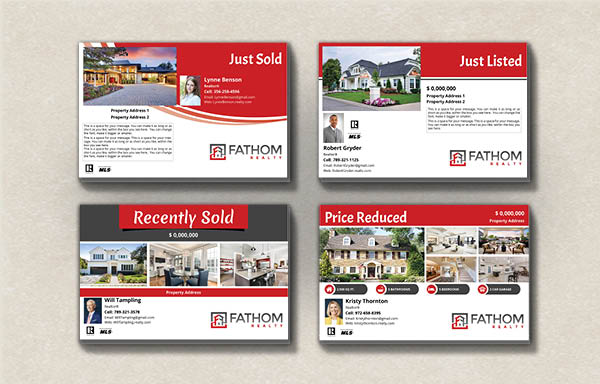 Need postcards for your next direct mail campaign? We have over fifty categories of branded designs for our Fathom Realty International real estate agents to use! Our postcards are printed on heavy 130 pound stock paper with a high-quality UV coating. (None of the flimsy stuff for our clients!) Select from standard size (4.5” x 5.5”) or make a bigger splash with our jumbo (5.5” x 8.5”) postcards. Craft your own custom card in minutes using our online design center’s vast library of custom templates and graphics with your own images and text.