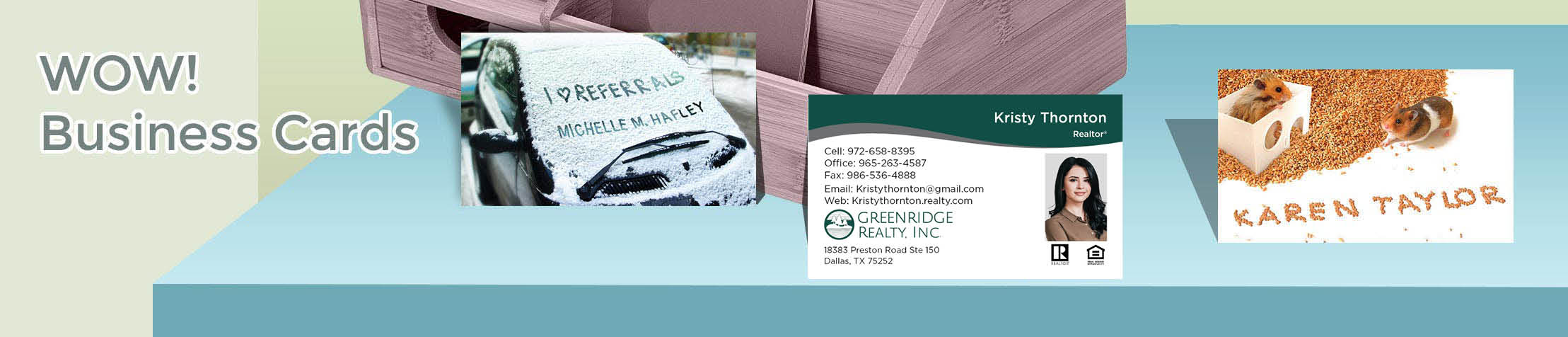 Looking to add a touch of WOW! factor to your real estate business cards? These cards are just what you've been looking for. The front of the card has plenty of space for all the traditional business and contact information you want to include. But instead of a boring white back, the reverse of the card lets you spell out your name in snow flakes, autumn leaves, or even Easter eggs. It's a great way to add some personality, some pizazz, even some WOW! to your Greenridge Realty real estate business cards!
