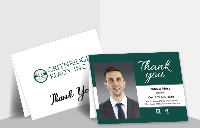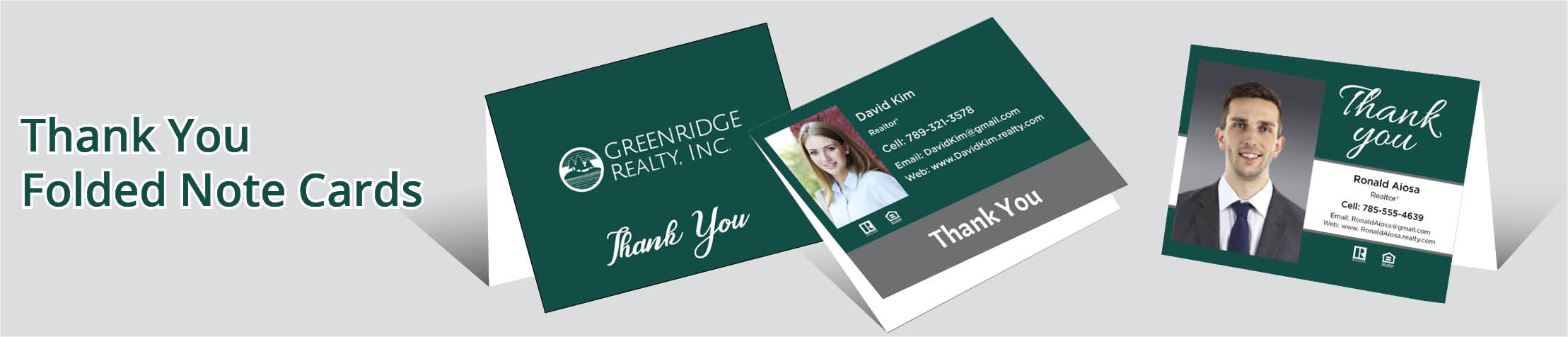 Your mother had it right -- saying “Thank You” really makes a difference. With our Greenridge Realty International branded, folded note cards, it’s easy to say Thank you: Thank you for the listing, thank you for closing, thank you for the referral, thank you for the invitation to speak and many other opportunities that appear in your daily travels. Note cards are also great for personal promotion, announcements and jotting a quick hand-written note to a potential, existing or past client.