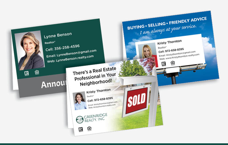 When it comes to marketing your real estate business, nothing beats the personal touch. Greenridge Realty folded note cards are an excellent way to keep in touch with past clients, set yourself apart with a promising prospect, or to say “Congrats!” after a close or “Thanks for your business!” when you land a listing. Our blank cards in your choice of bold Greenridge Realty colors are a great way to make your message your own, or you can give your direct mail marketing a special appeal with personalized folded note cards. Choose from standard or jumbo-sized cards, available in a wide range of designer styles and templates.