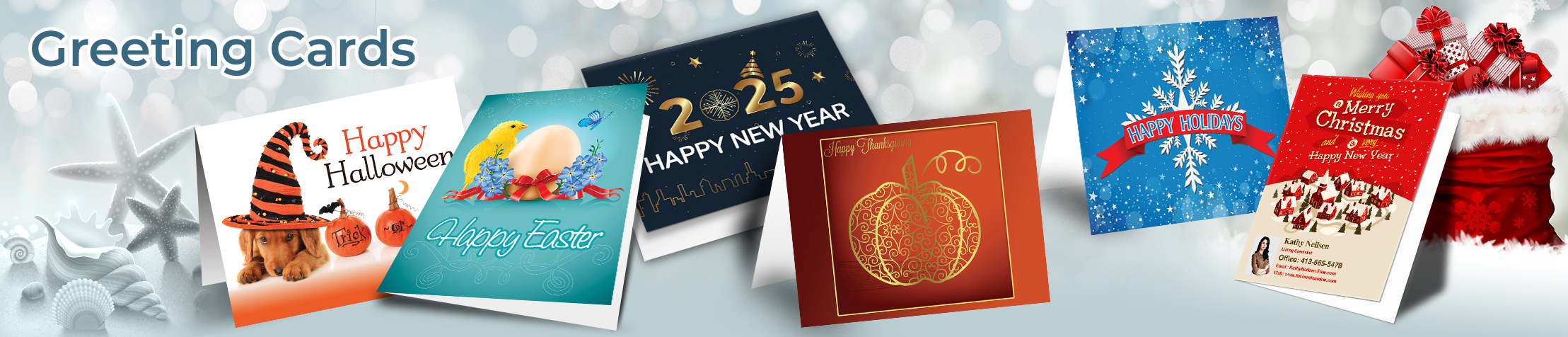 You are invited to the party! Our real estate greeting cards give you the opportunity to add a personal touch to your marketing list.Your real estate clients and prospects send greeting cards for events, holidays and occasion—and so should you. The popularity of greeting cards has not been diminished by email or other electronic media. According to the Greeting Card Association, 9 out of 10 U.S. households buy greeting cards annually. So, impress everyone on your real estate marketing list with a card from our extensive line of seasonal, holidays and events greeting cards designed especially for Greenridge Realty Realtors. Make seasonal, holiday and event-related greeting cards part of your real estate marketing strategy, along with calendars, postcards, postcard direct mailing, and more.