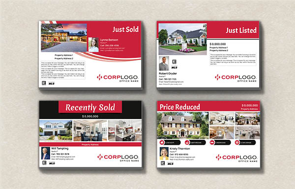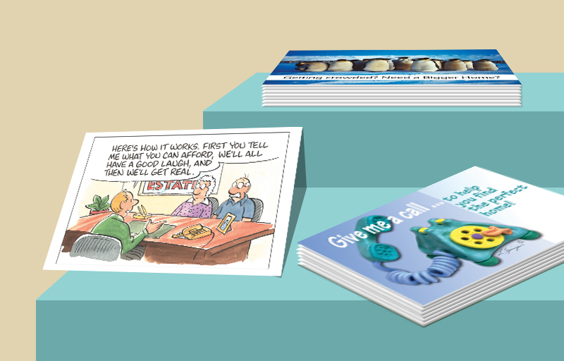 Need postcards for your next marketing campaign? We have over fifty categories of branded designs for our Home Smart real estate agents to use! Our postcards are printed on heavy 130 pound stock paper with a high-quality UV coating. (None of the flimsy stuff for our clients!) Select from standard size (4.5" x 5.5") or make a bigger splash with our jumbo (5.5" x 8.5") postcards. Craft your own custom card in minutes using our online design center's vast library of custom templates and graphics with your own images and text.