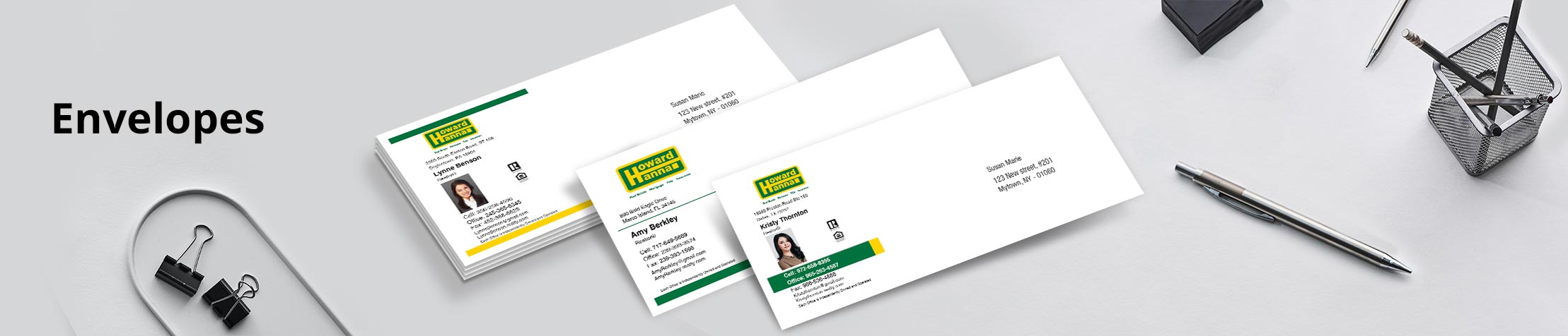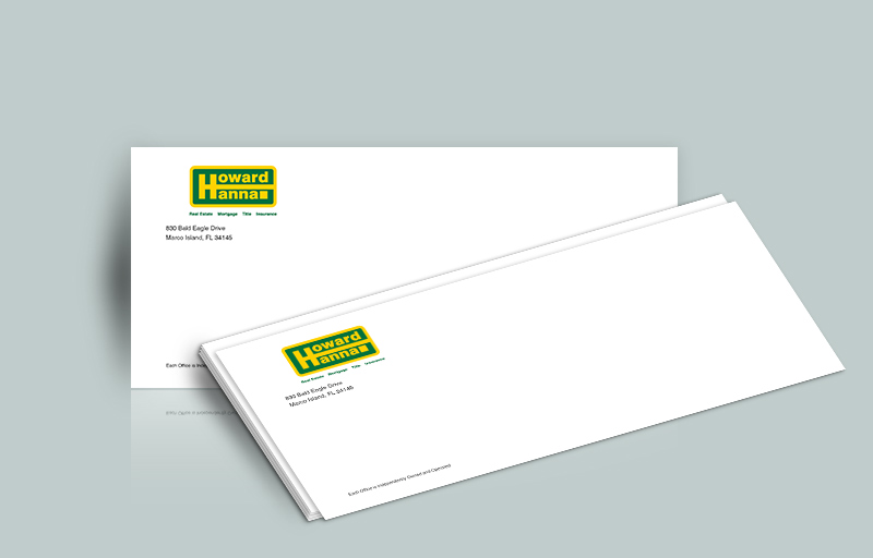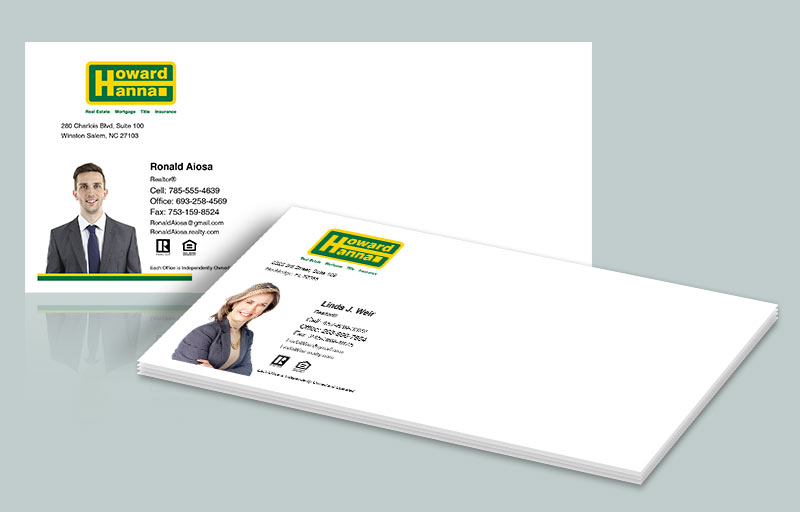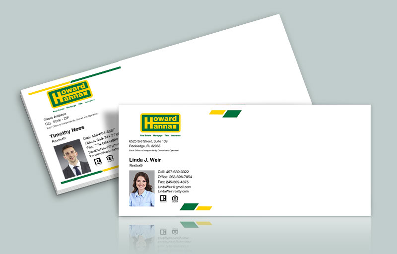 • Banish the bland and enhance your reputation with these gorgeous, professional Howard Hanna #10 envelopes. Custom design options will boost your brand recognition, save you time when addressing envelopes, and make a real impact on your mailing list. Choose from office envelopes with an easy-to-recognize Howard Hanna logo design, or pick one of our striking agent envelope designs customized with your contact information, designations, and even a standard or silhouette photo. No matter what design you choose, you’ll get great products, affordable prices, and excellent customer service from BestPrintBuy.