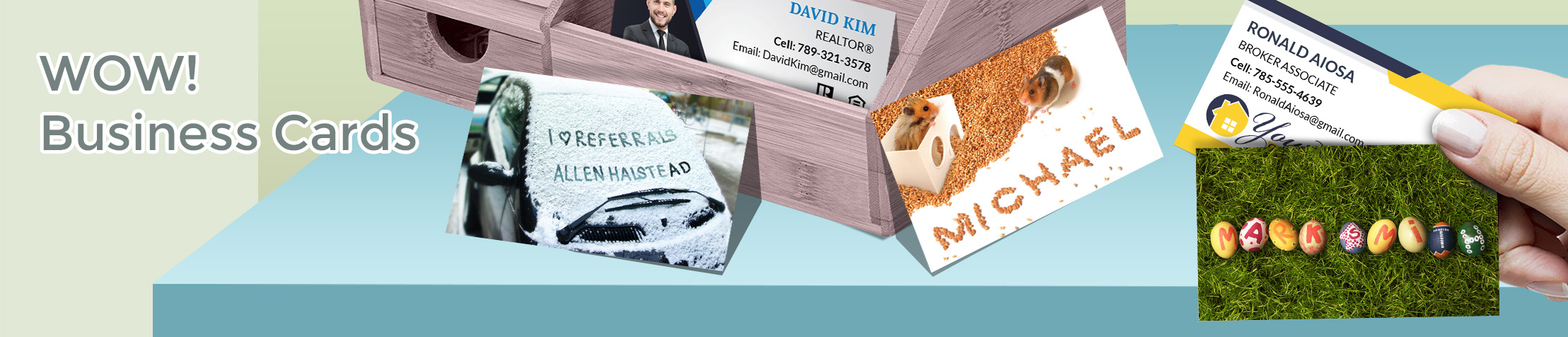 Looking to add a touch of WOW! factor to your real estate business cards? These cards are just what you've been looking for. The front of the card has plenty of space for all the traditional business and contact information you want to include. But instead of a boring white back, the reverse of the card lets you spell out your name in snow flakes, autumn leaves, colorful balloons, or even Easter eggs. It's a great way to add some personality some pizazz even some WOW! to your real estate business cards!