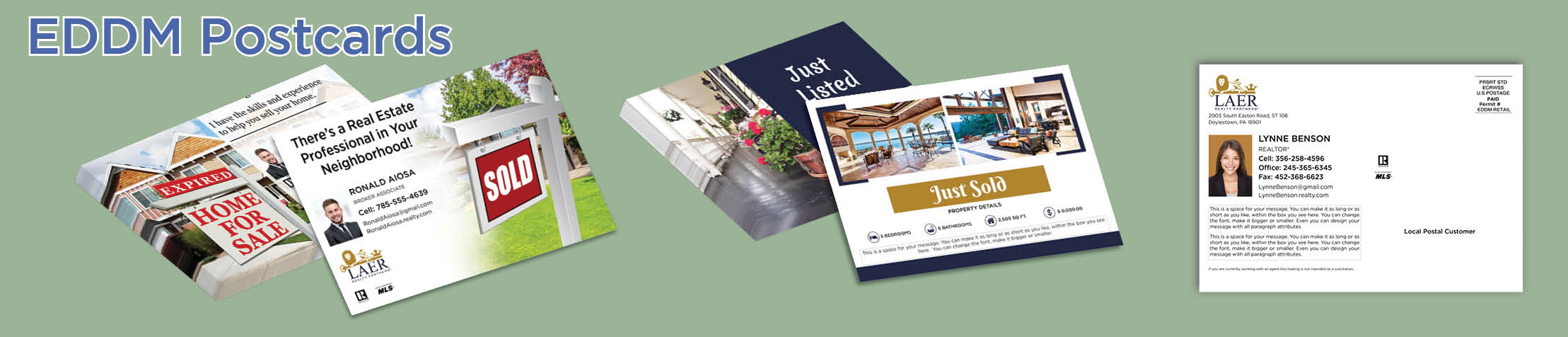 Make mailing lists a thing of the past with on-target, on-budget LAER Realty Partners EDDM real estate postcards. With the USPS's Every Door Direct Mail program, you can select your target area by city, street name, or zip code, and deliver to every house along the mailing route. BestPrintBuy offers a huge selection of customizable real estate EDDM postcards that meet the requirements of the program. All you have to do is choose a style you like, customize your message, and take your cards to the post office once they arrive.