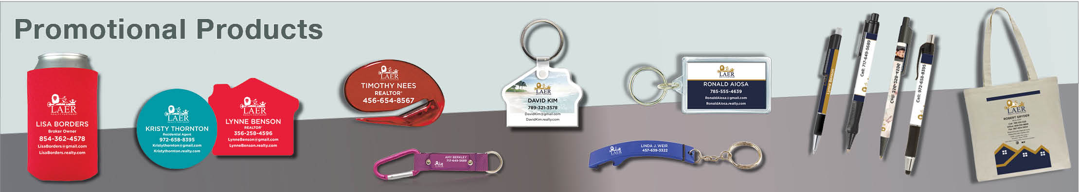 Business Cards, Postcards, Stationery, Name Badges, Door Hangers, Postcard Mailing (Direct Mail), Real Estate Signs, Presentation Folders, Real Estate Car Magnets, Promotional Products, EDDM and more.