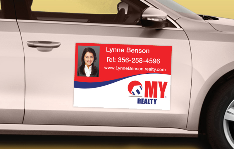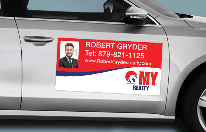 Car magnets are a versatile solution for real estate professionals who want to increase their visibility and name recognition. All of our magnets are printed on a durable 30 mil magnet stock, with gloss coating on the front to ensure readability. These real estate car magnets are a great way to promote individual agents or an entire office. With our easy ordering process, you can have an official My Realty branded car magnet complete with your name, contact information, and even photo, at your doorstep in just a few days!