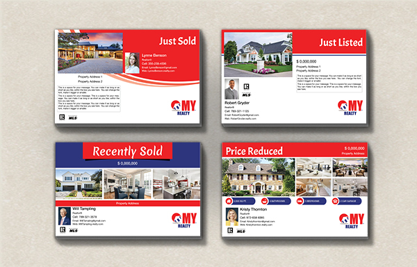 Need postcards for your next direct mail campaign? We have over fifty categories of branded designs for our My Realty International real estate agents to use! Our postcards are printed on heavy 130 pound stock paper with a high-quality UV coating. (None of the flimsy stuff for our clients!) Select from standard size (4.5” x 5.5”) or make a bigger splash with our jumbo (5.5” x 8.5”) postcards. Craft your own custom card in minutes using our online design center’s vast library of custom templates and graphics with your own images and text.