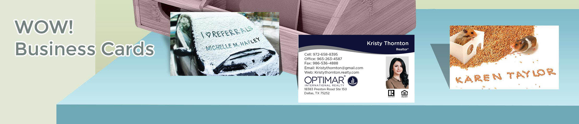 Looking to add a touch of WOW! factor to your real estate business cards? These cards are just what you've been looking for. The front of the card has plenty of space for all the traditional business and contact information you want to include. But instead of a boring white back, the reverse of the card lets you spell out your name in snow flakes, autumn leaves, or even Easter eggs. It's a great way to add some personality, some pizazz, even some WOW! to your Optimar International real estate business cards!