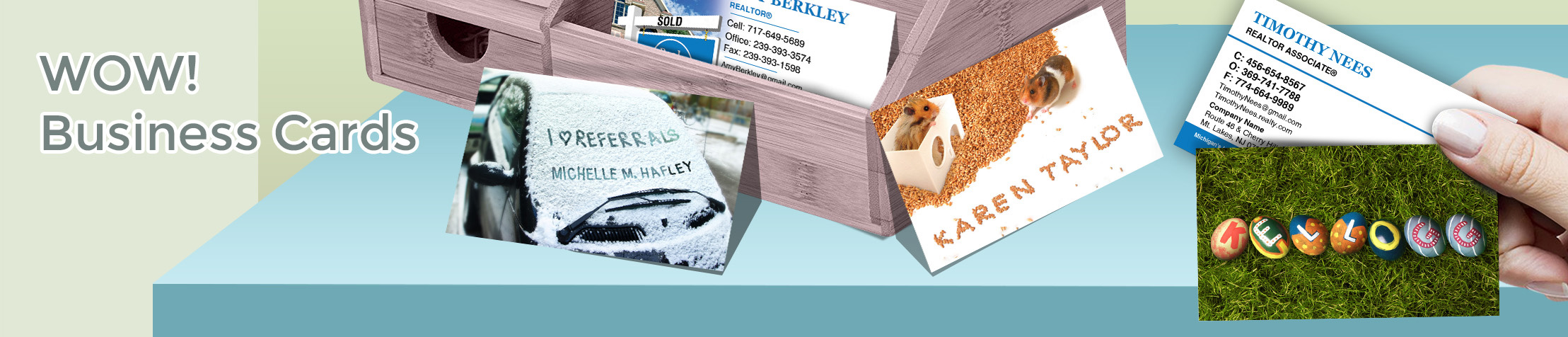 Looking to add a touch of WOW! factor to your real estate business cards? These cards are just what you've been looking for. The front of the card has plenty of space for all the traditional business and contact information you want to include. But instead of a boring white back, the reverse of the card lets you spell out your name in snow flakes, autumn leaves, colorful balloons, or even Easter eggs. It's a great way to add some personality some pizazz even some WOW! to your real estate business cards!