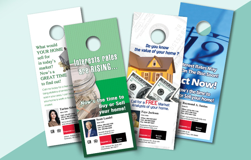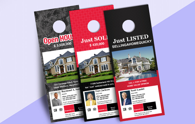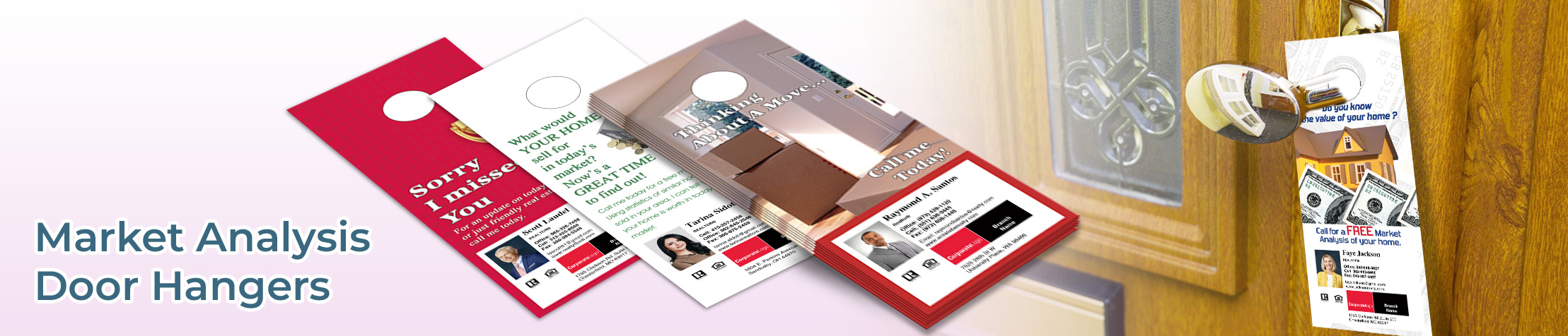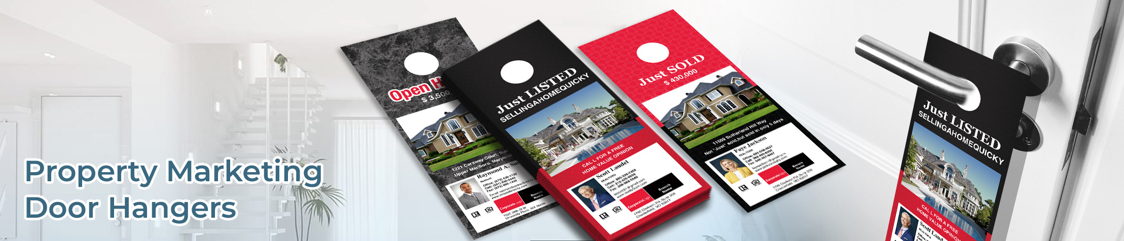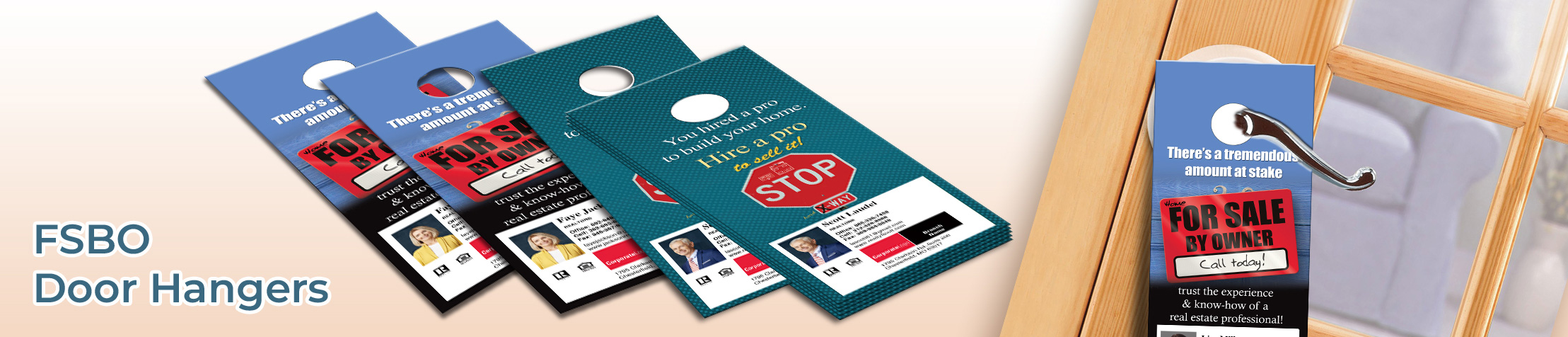 Old-school house calls! Use our real estate door hangers to introduce your realty services to prospects in your territory. We have door hangers for specific events, like open houses and for the holidays. Professionally printed, these eye-catching real estate door hangers get noticed! Add our door hangers to your next real estate marketing campaign. And it’s easy to customize them with photos and text in our design center. Our door hangers for real estate professionals are budget-friendly and full-color, with a trim size of 4.25 x 11 inches and a bleed size of 4.5 x 11.25 inches. Order your real estate door hangers today, and you’ll have them by next week!