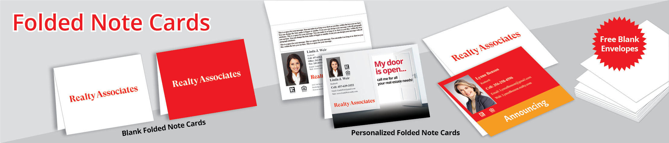 When it comes to marketing your real estate business, nothing beats the personal touch. Realty Associates folded note cards are an excellent way to keep in touch with past clients, set yourself apart with a promising prospect, or say “Congrats!” after a close or “Thanks for your business!” when you land a listing. BestPrintBuy’s blank cards in your choice of bold Realty Associates colors are a great way to make your message your own, or you can give your direct mail marketing a special appeal with personalized realtor folded note cards. Choose from standard or jumbo-sized cards, available in a wide range of designer styles and templates.Contact us for our Realty Associates folded note cards.