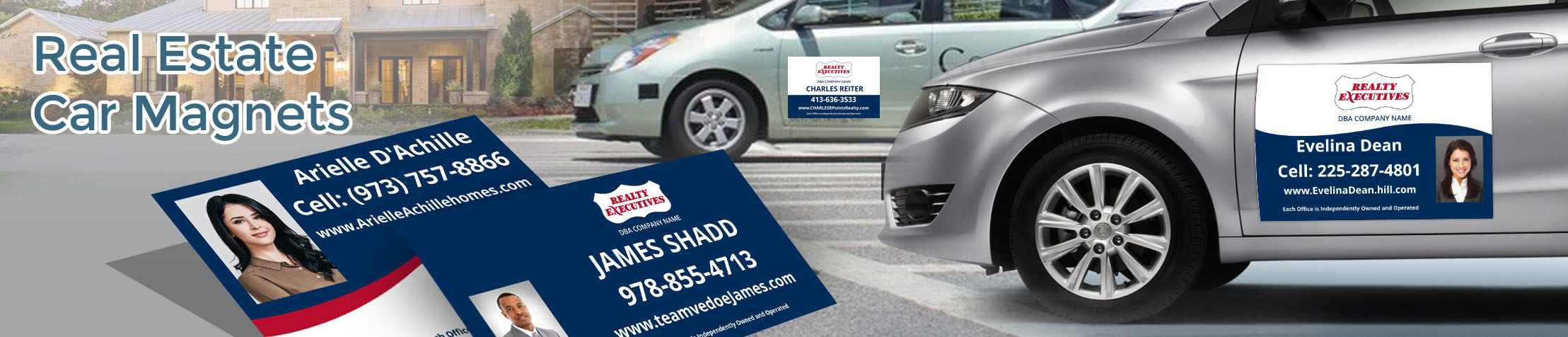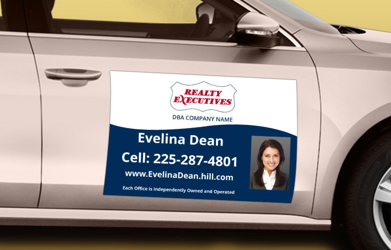 Car magnets are a versatile solution for real estate professionals who want to increase their visibility and name recognition. All of our magnets are printed on a durable 30 mil magnet stock, with gloss coating on the front to ensure readability. Available with or without photos, and in a 12 x 18 or 12 x 24 inch size, these real estate car magnets are a great way to promote individual agents or an entire office. With our easy ordering process, you can have an official Realty Executives branded car magnet complete with your name, contact information, and even photo, at your doorstep in just a few days!