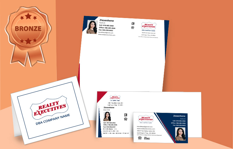 An agent bronze starter kit has 250 business cards, 250 letterheads, 250 #10 envelopes and 50 standard folded note cards with envelopes. All you need to do is design your business card and we will craft your entire package for you.