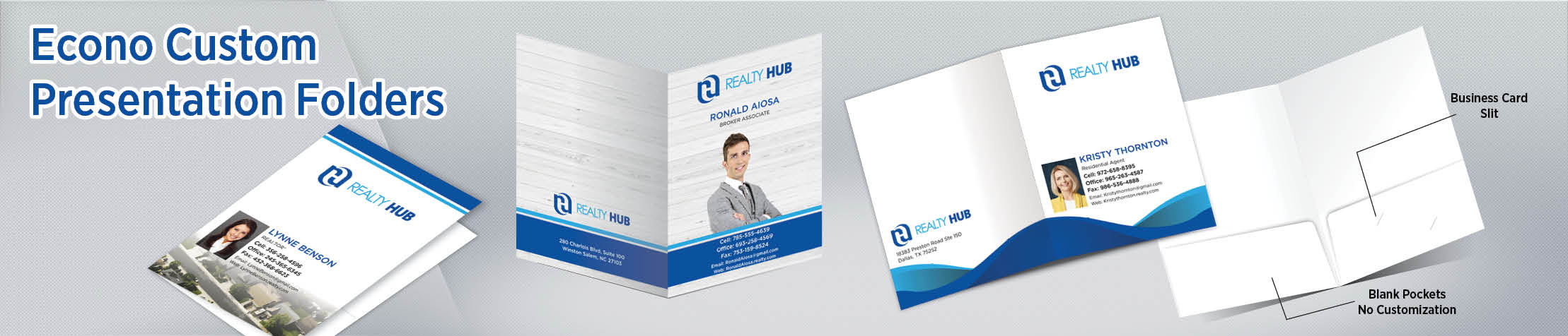 There’s no second chance when it comes to making a first impression. If you’re presenting a listing agreement, marketing plan, contract offer, or other important documents, you want your clients to know that you’re a reliable and trustworthy professional. Custom Realty Hub presentation folders from BestPrintBuy help you do exactly that. You’ll be able to present all your information in an elegant, organized fashion. And whether you choose personalized presentation folders or opt for a stock folder with business card cut-outs, your contact information will be kept easily at hand.