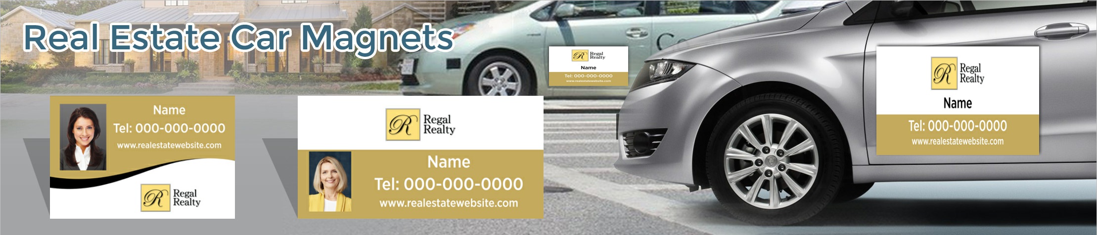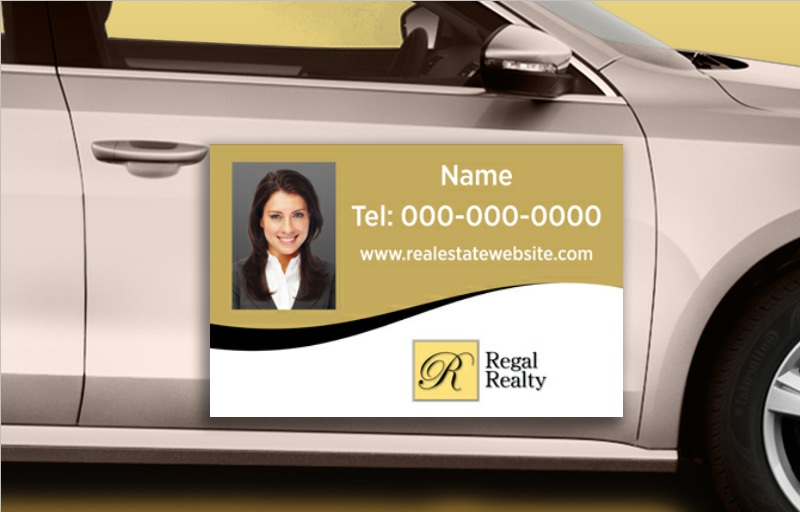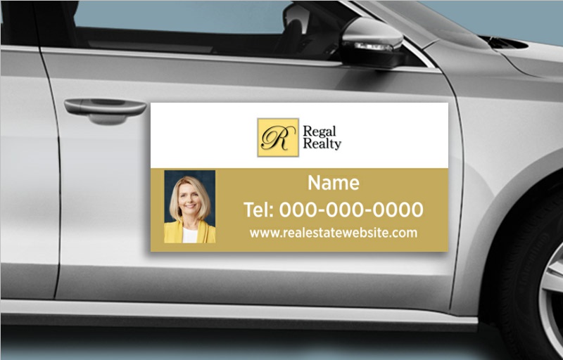 Car magnets are a versatile solution for real estate professionals who want to increase their visibility and name recognition. All of our magnets are printed on a durable 30 mil magnet stock, with gloss coating on the front to ensure readability. Available with or without photos, and in a 12 by 18 or 12 by 24 inch size, these real estate car magnets are a great way to promote individual agents or an entire office. With our easy ordering process, you can have an official Regal Realty branded car magnet complete with your name, contact information, and even photo, at your doorstep in just a few days!