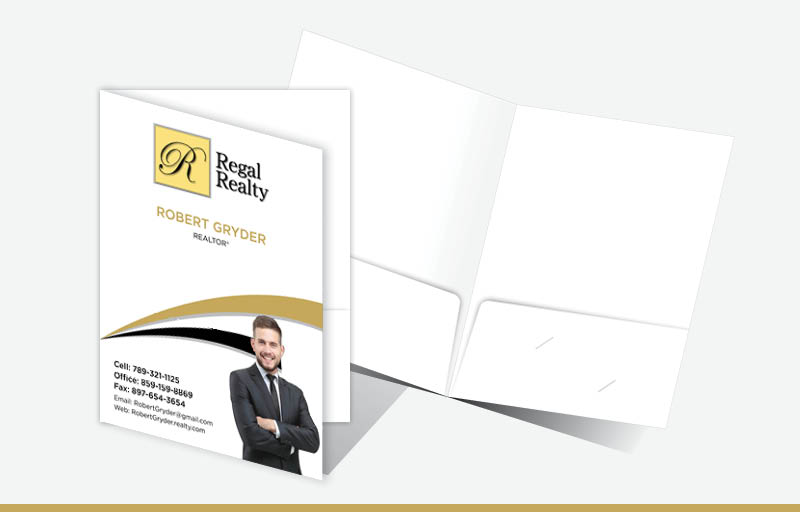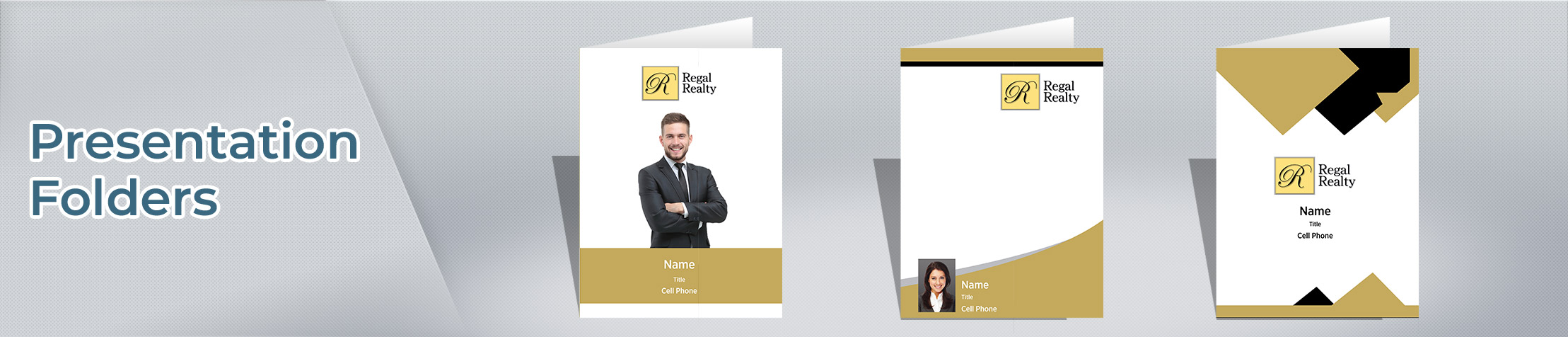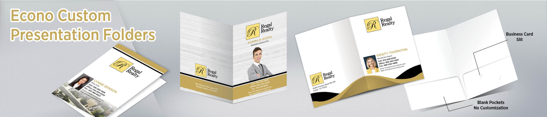 Custom Regal Realty presentation folders from BestPrintBuy help you present all your information elegantly and efficiently. With our custom real estate presentation folders featuring business card slots, your contact information will be easily at hand. There’s no second chance when it comes to making a first impression. If you’re presenting a listing agreement, marketing plan, contract offer, or other important documents, you want your clients to know that you’re a reliable and trustworthy professional. Contact us to ensure your next presentation makes a lasting impact with Regal Realty presentation folders!