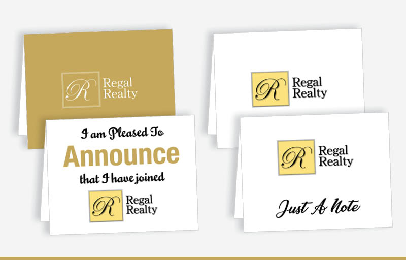When it comes to marketing your real estate business, nothing beats the personal touch. Regal Realty folded note cards are an excellent way to keep in touch with past clients, set yourself apart with a promising prospect, or to say “Congrats!” after a close or “Thanks for your business!” when you land a listing. Our blank cards in your choice of bold Regal Realty colors are a great way to make your message your own, or you can give your direct mail marketing a special appeal with personalized folded note cards. Choose from standard or jumbo-sized cards, available in a wide range of designer styles and templates.