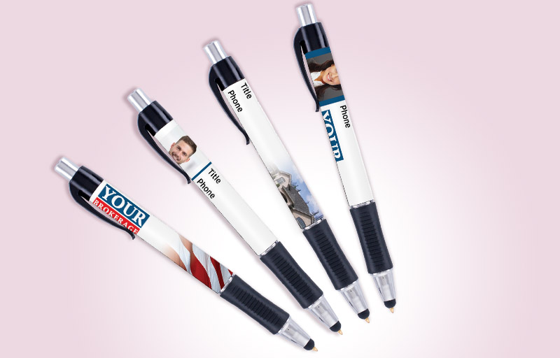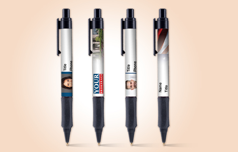 Personalized pens have been a classic real estate promotional item for years, and for good reason – it doesn’t get much more useful than an ink pen. We offer three varieties of grip pen with an imprint area greater than 3 inches, as well as a Colorama pen with a longer imprint area. Choose from blue or black EverSmooth ink on any of our Regal Realty pens, as well as personalization with all of your contact info and even a photo option.