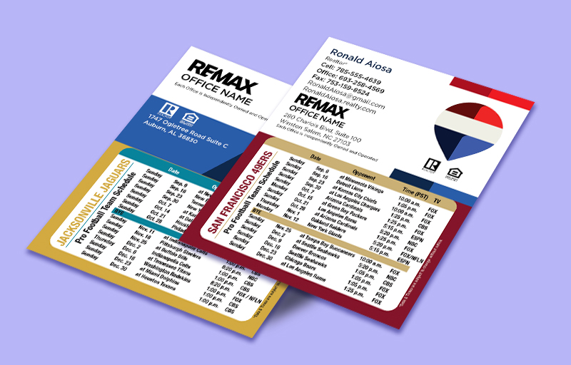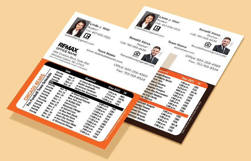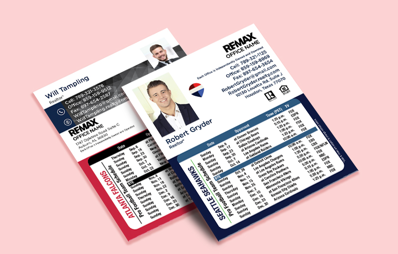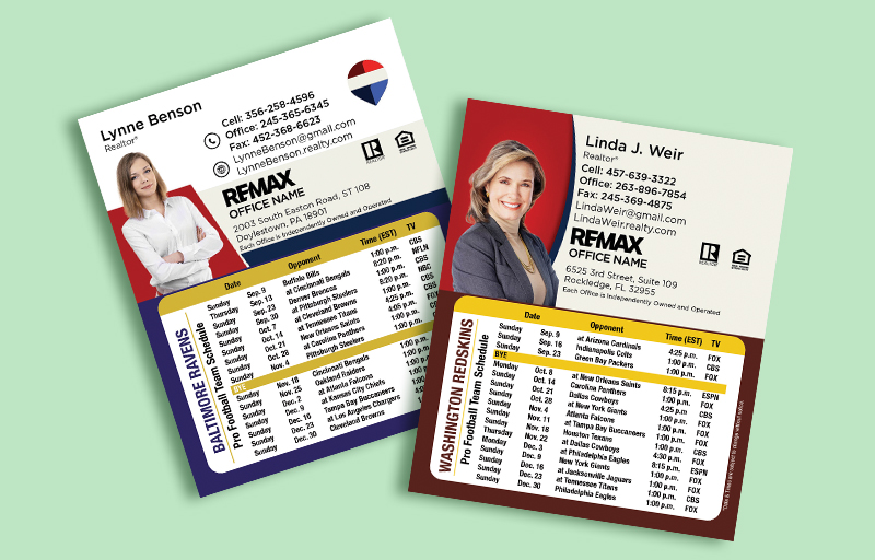 Our popular full magnetic schedules are now available in a compact size that keeps the important information front and center, without taking up too much of your clients' valuable fridge space. These NFL magnets are a great real estate marketing tool. They are available in custom colors for every team in the league, and indicate the opposing team, location, time, and broadcast channel for each game of the pre-season and regular season.