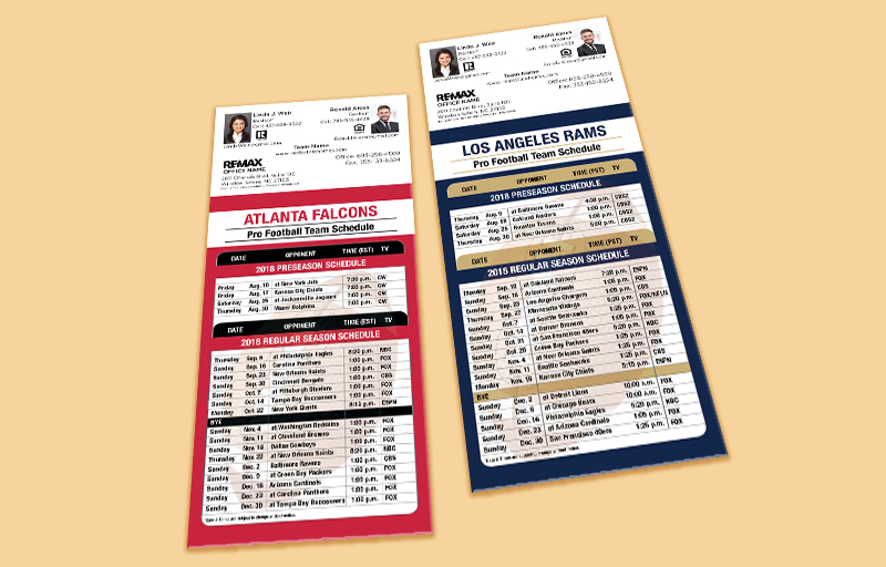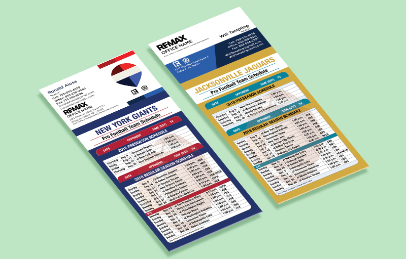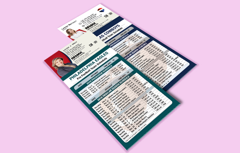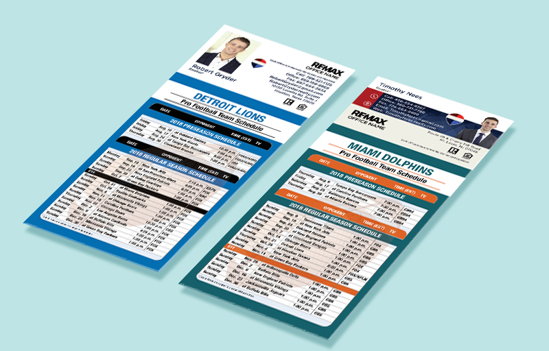 Business card magnetic schedules are some of the most versatile magnetic schedules we offer. Choose from a huge array of customizable design options, including special designs for luxury homes, commercial real estate, real estate agent teams, and even designs that allow you to upload a unique QR code. Available in team colors for any team, these magnetic business card football schedules have RE/MAX branding built right into the template, making ordering a snap for all of our RE/MAX agents.