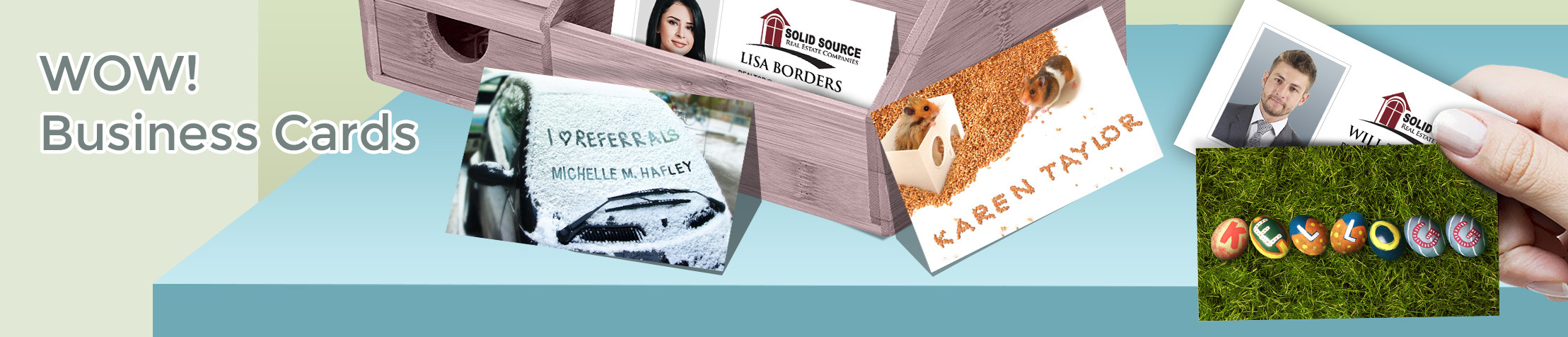 Looking to add a touch of WOW! factor to your real estate business cards? These cards are just what you've been looking for. The front of the card has plenty of space for all the traditional business and contact information you want to include. But instead of a boring white back, the reverse of the card lets you spell out your name in snow flakes, autumn leaves, or even Easter eggs. It's a great way to add some personality, some pizazz, even some WOW! to your Solid Source real estate business cards!