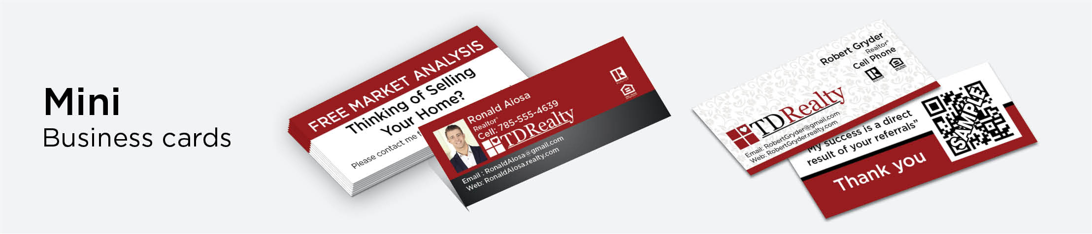 • A mini real estate business card makes a big impact with a small footprint. BestPrintBuy offers mini business cards at a great value, with bold design choices that highlight your contact details. Choose from several design options with or without a photo, including matching two-sided mini business cards that double your available space without taking up any more room.